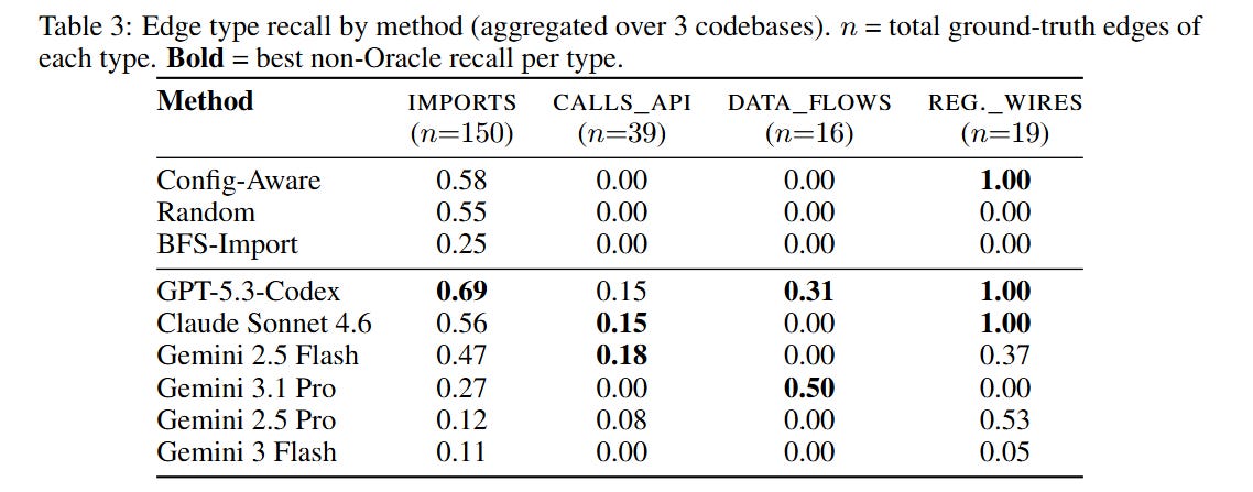 #4. LLMs discover edge types that baselines can’t. Rule-based strategies (follow imports, read config files) find at most two of the four edge types. LLM agents collectively find all four, including DATA_FLOWS_TO edges that require multi-hop reasoning through the orchestration code. That said, the two strongest LLMs only beat baselines by 9-10 F1 points, and weaker LLMs score below simple heuristics.