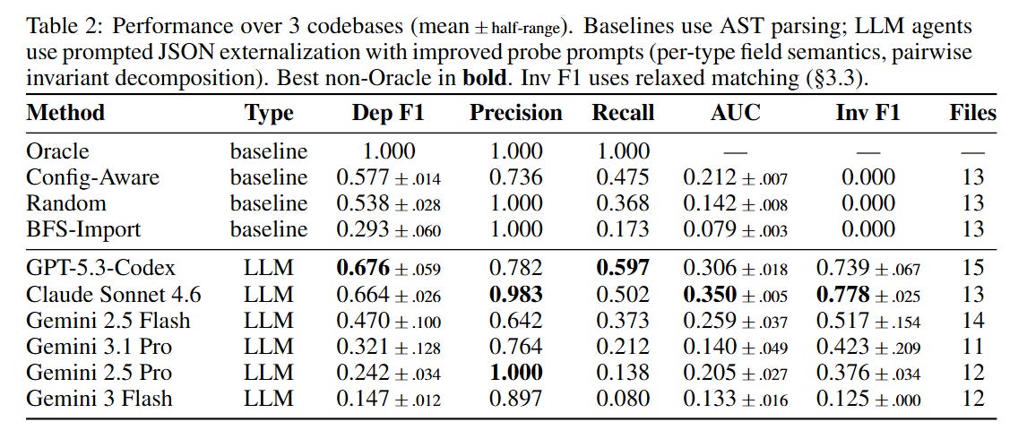 #5. Agents can discover architectural constraints — but only if you ask precisely enough. We plant 15-16 constraints per codebase (forbidden dependencies, interface-only access rules, validation chains) and test whether agents find them. With our initial prompt, every model scored zero. After adding per-type field definitions and worked examples, the top models jumped to invariant F1 of 0.78 (Claude) and 0.74 (GPT). Baselines score zero regardless — they can't reason about cross-cutting constraints at all. This was one of our most instructive findings: what looked like a model capability gap turned out to be a prompt specification gap. It's a warning for anyone building belief-probing benchmarks.