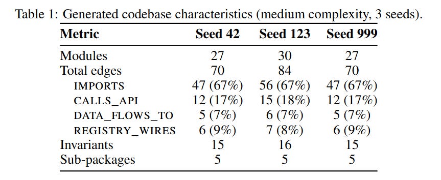 Procedurally generated codebases with known ground truth — you need to know the “true architecture” to score the agent’s beliefs