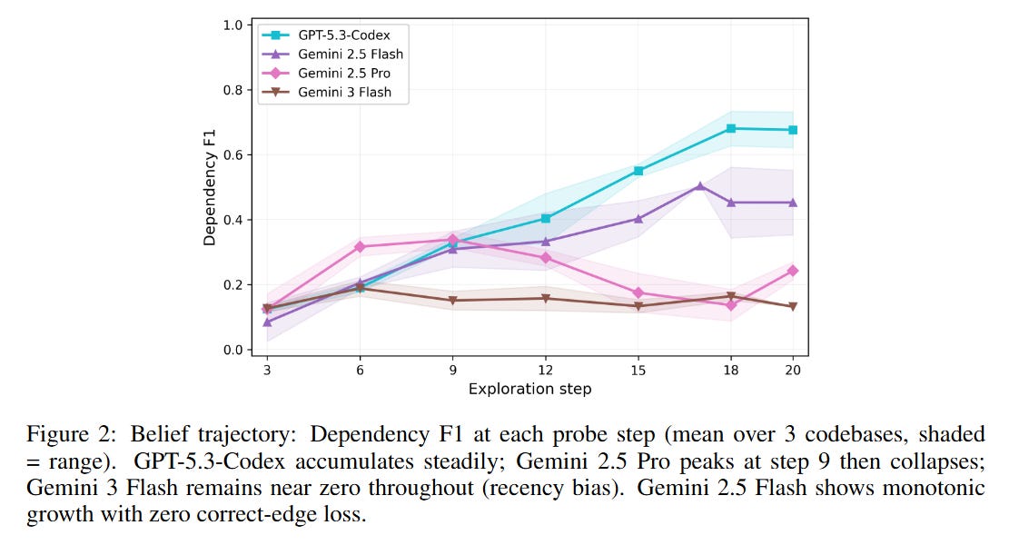#3. Belief state maintenance varies dramatically — and not by model size. Gemini 2.5 Flash (the smaller model) maintains perfectly stable beliefs across all probes — zero correct edges lost. Its larger sibling, Gemini 2.5 Pro, builds a reasonable map early on, then catastrophically collapses, losing 12 correct edges in a single probe step. Gemini 3 Flash shows pure recency bias — each probe reports only the last 3-5 components it examined, as if the model treats each probe as “summarize the architecture from scratch” rather than “update your running belief.”