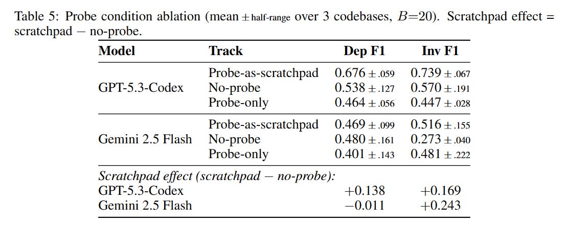 #2. Self-scaffolding through belief externalization is model-dependent. Retaining the structured belief map in context (scratchpad mode) boosts GPT’s F1 by 14 points — it uses its own previous maps as working memory. But Gemini gets no dependency-level benefit from the same mechanism. The scratchpad helps Gemini only for invariant discovery, not structural mapping. Different models leverage the same external state through different cognitive channels.