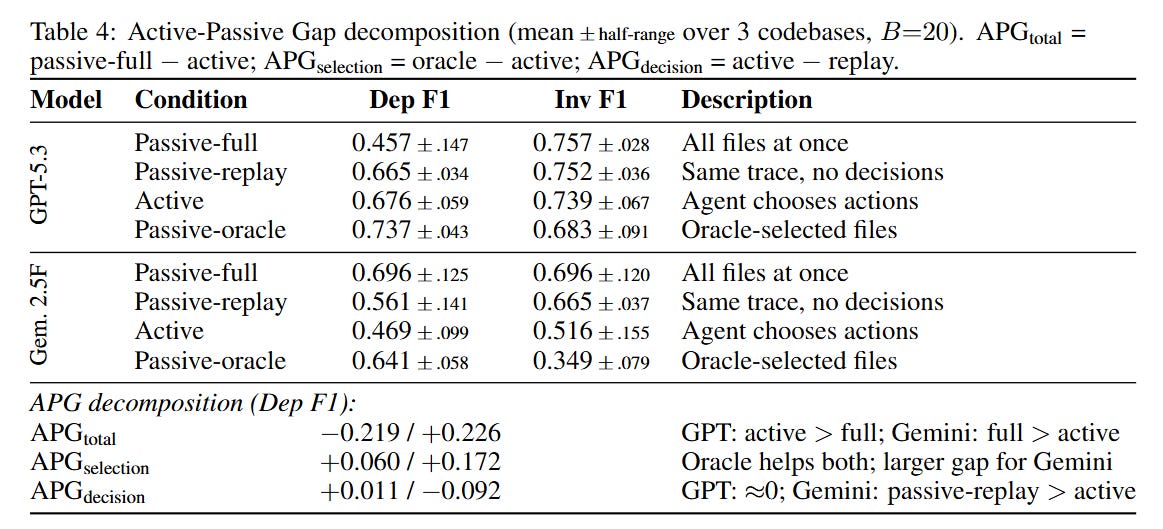 #1. The Active-Passive Gap direction is model-dependent. In spatial reasoning, models consistently do worse in active mode. In code, it depends on the model. GPT-5.3-Codex actually performs better through active exploration than when given the full codebase at once (APG = −0.22) — likely because 27-30 files dumped simultaneously creates information overload, while sequential exploration allows focused processing. Gemini 2.5 Flash shows the opposite pattern (APG = +0.23). Active exploration is itself a capability that some models have and others don’t (or maybe there are other effects in place).