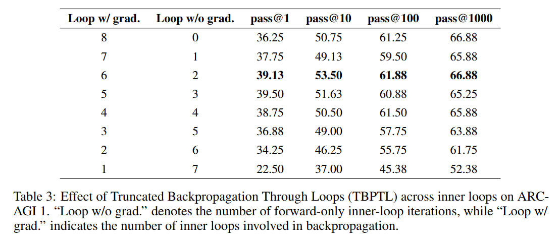 TBPTL is needed to limit the depth of recursion; it only computes gradients of late cycles. Inside TRM and HRM there was also similar logic: HRM used gradients only from the last cycle (final state H of the module and final state of the L-module), and TRM during deep recursion ran the internal cycle without tracking gradients for all times except the last. (Also don’t forget that in the highest-level deep supervision loop, output values are detached from the computation graph and passed to the next improvement step simply as input data).
