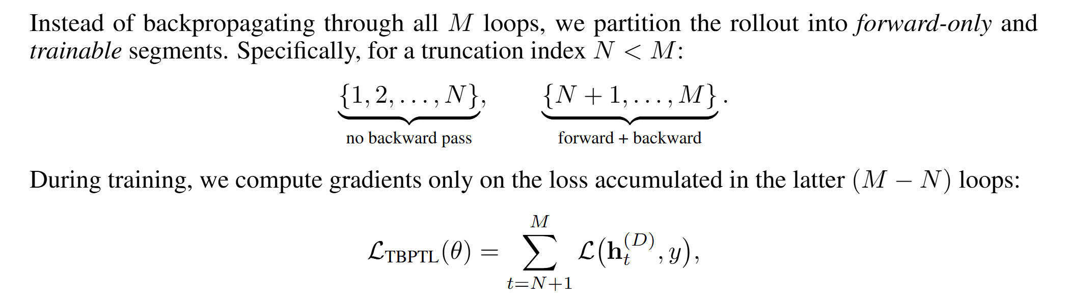 Instead of full backprop through all M iterations, we set a cutoff index N<M, so for all steps from 1 to N, backprop is not done, and for N+1 .. M it is done. Conceptually, absolutely the same logic—in the loss we only account for the last computations.