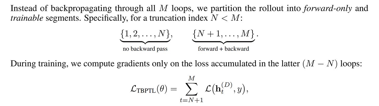 TBPTL does approximately the same thing. If you take a model with D layers and apply it iteratively over M iterations, then new representations htd of layer d ∈ {1, . . . , D} at iteration t ∈ {1, . . . , M} will be computed as a function of htd-1 (previous layer of the same iteration) and hdt-1 (same layer of the previous iteration). Here, by the way, I’m also not sure they wrote this correctly—this thing with the same layer of the previous iteration is somewhat dubious, IMHO. I perceived it as nested loops.