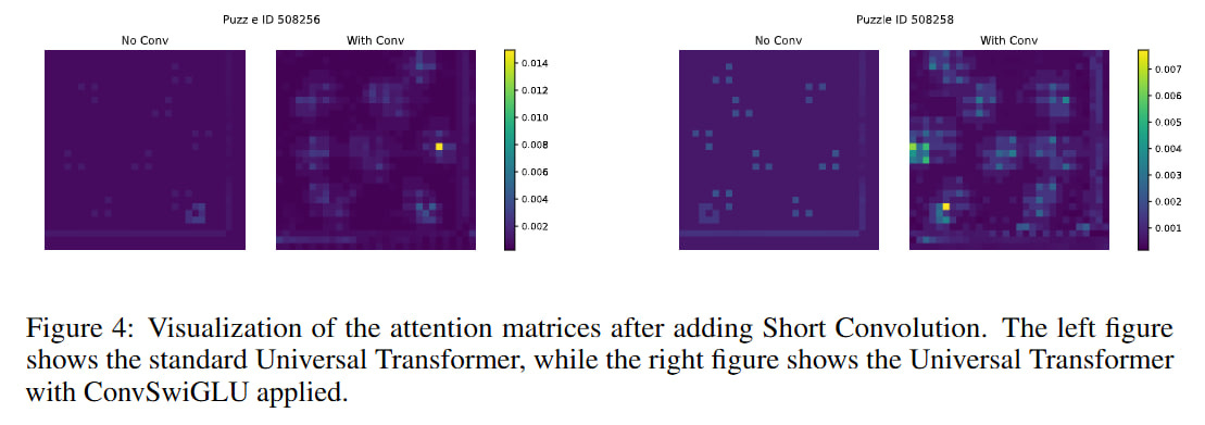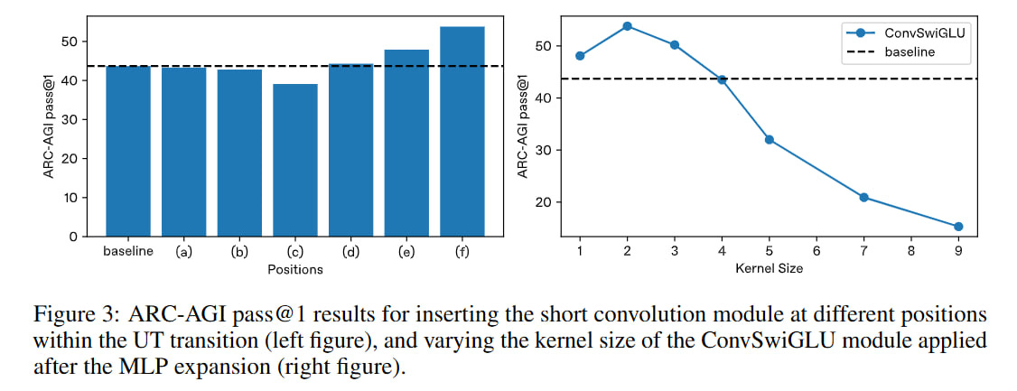 They conducted experiments with convolutions of different sizes; for a kernel size of 2, the best result was obtained. They tried rearranging convolutions in different places in the transformer. Inside the attention mechanism, the position has little effect on anything and sometimes even makes everything worse. The best result (on ARC-AGI) is if you place it after MLP expansion. But this doesn’t quite correspond to the position in the picture—it’s certainly after expansion, but it’s already after the gate too. Maybe they just described all this imprecisely.