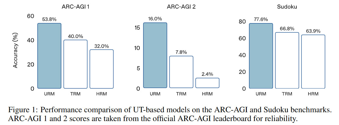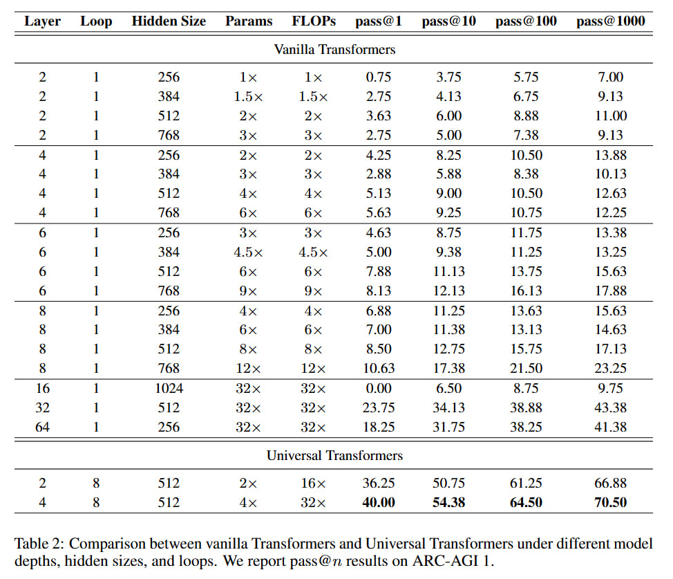 Interestingly, the authors ran many variants of regular transformers and a couple of UT variants on ARC-AGI-1 and showed the numbers.