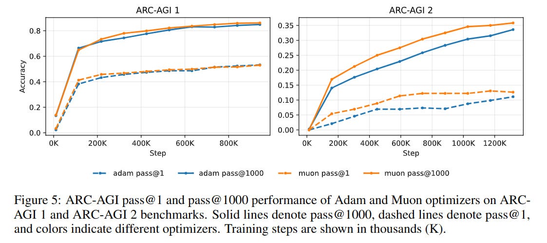 Muon gave faster convergence, almost twice as fast on ARC-AGI-2, but the same final result. With Muon, though, the devil is in the details—which layers it’s applied to, with what exact hyperparameters. The paper has no details, need to dig into the code (provided it corresponds).