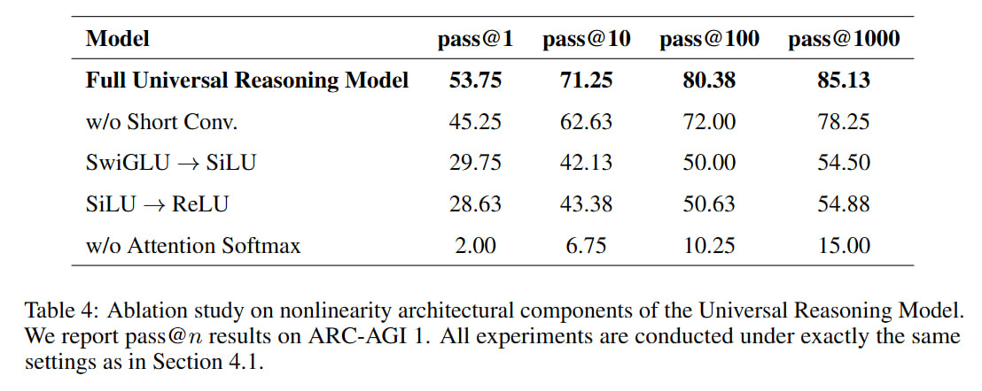 As I understand it, they came to this activation theme after studying ablations that showed that sequentially removing nonlinearity from the activation function monotonically decreases performance on ARC-AGI-1. This, it seems to me, generally agrees with the ranking of the activation functions mentioned there: SwiGLU → SiLU → ReLU. There’s nothing new here that SiLU/swish is better than ReLU, and a function with gating is even better. So they decided to add even more nonlinearity.