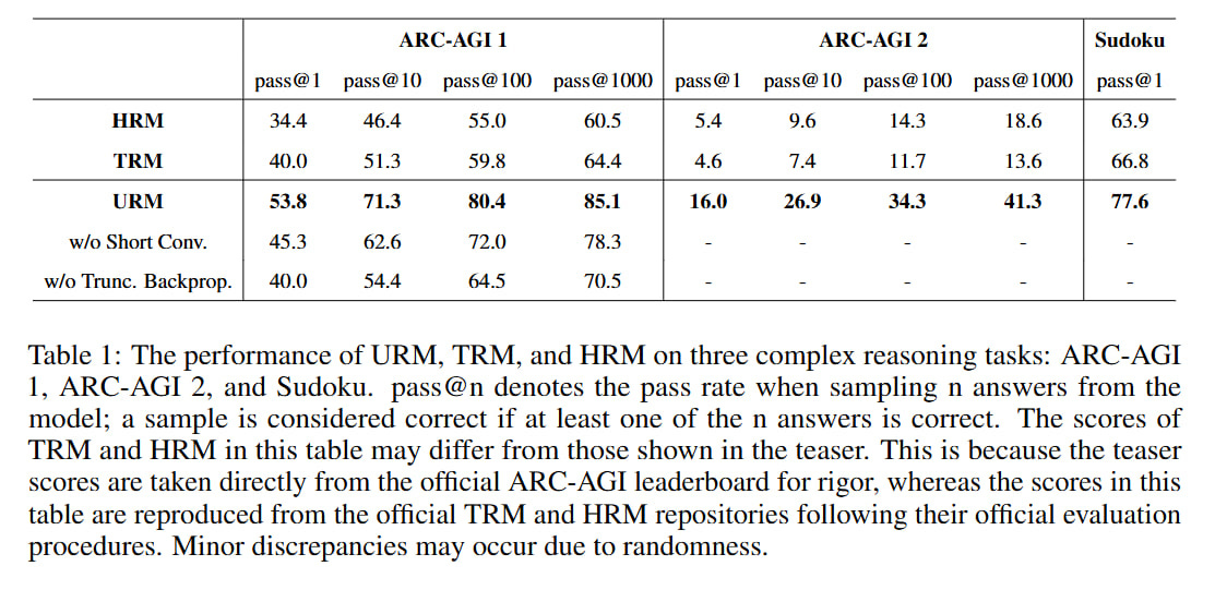 Interestingly, the scores differ noticeably from the scores in the HRM/TRM papers. For example, for Sudoku, the HRM and TRM results were 87.4/74.7 (TRM had two different versions, with MLP and SA) and 55.0 respectively. Here in the paper, the scores of these models are 63.9 and 66.8, which is interesting because, first, it’s noticeably less for TRM, and second, the difference between them became extremely small. URM has a score of 77.6, which is higher than the TRM/HRM numbers from the current work but lower than the original TRM work. On ARC-AGI-2, here HRM is generally higher than TRM, which was obviously different in the TRM paper, and also different in the picture from the beginning of the paper, where they explicitly say they took the numbers from ARC-AGI.
