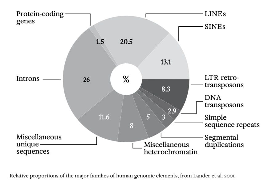 All this nicely resonates with the viral world and the presence in our DNA of a huge number of mobile elements, transposons, and viral DNA. We also have a bunch of sub-replicators inside the genome.