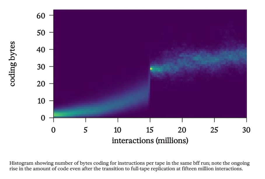 Early replicators were most likely unable to perfectly copy everything, and copied only small pieces of code, inserting them anywhere. This was a chaotic phase, when everything still looks like random, but the number of computations begins to grow. In the article there was also a stage of poisoning the soup with zeros due to low-quality replicators. Poor replicators compete with each other, and also participate in symbiotic events. Tracing the origin of individual bytes in the soup can help see what’s happening in it. There’s a cool new video here about the origin of individual bytes in the ecosystem: