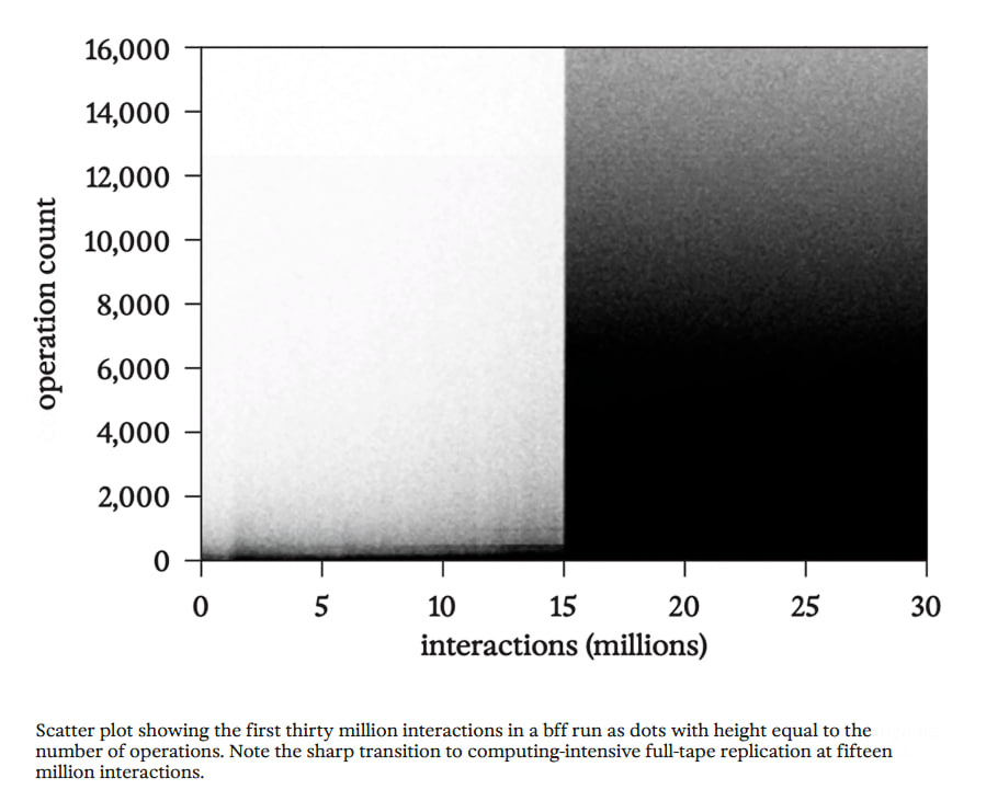 The chapter on Artificial Life tells about the results of that article with Brainfuck (bff). There are new pictures here that weren’t in the original article: about the jump-like growth in the number of computations and about the number of encoding bytes on the tape.